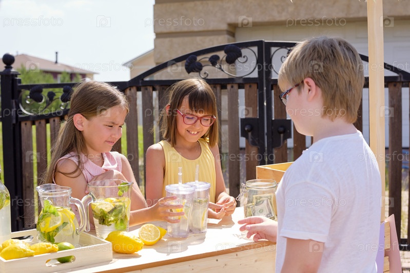 Молодой мальчик покупает стакан свежего прохладного лимонада, приготовленного двумя девушками