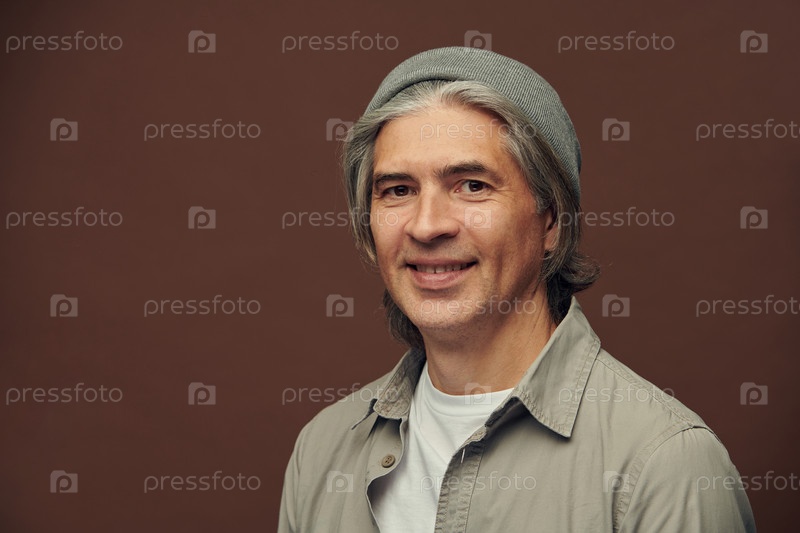 Портрет улыбающегося хипстера пожилого человека в серой шляпе, стоящего на изолированном коричневом фоне