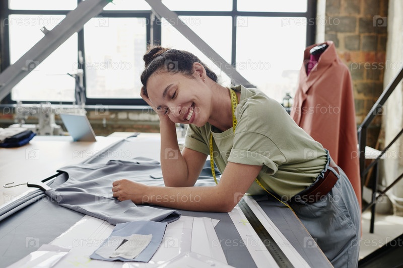 Молодой веселый портной или дизайнер одежды в повседневной форме, прислонившись к столу