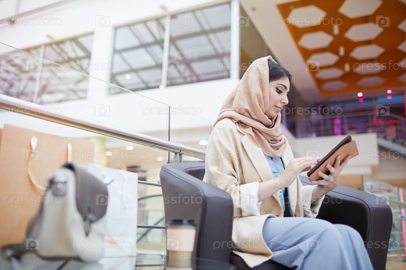 Молодая женщина с Ближнего Востока использует цифровой планшет в торговом центре
