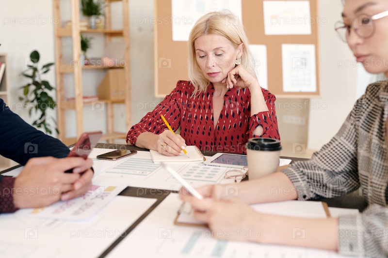 Зрелая блондинка разработчик мобильных приложений делает заметки в блокноте