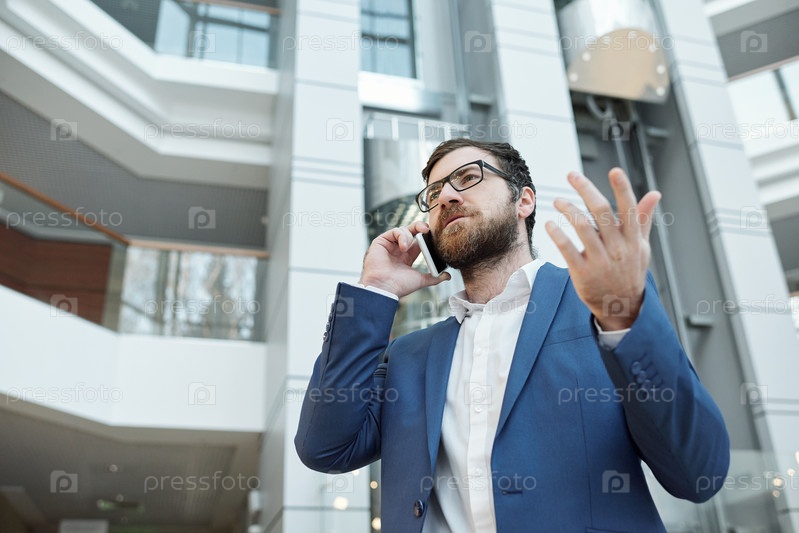 Молодой бородатый бизнесмен в формальной одежде и очках разговаривает по мобильному телефону