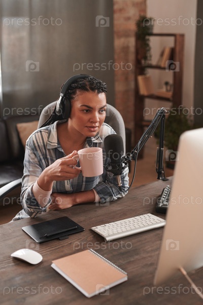 Вертикальный высокоугольный портрет стильной молодой женщины с афро-плетениями, сидящей за столом в комнате на чердаке, создающей контент для блога и пьющих кофе