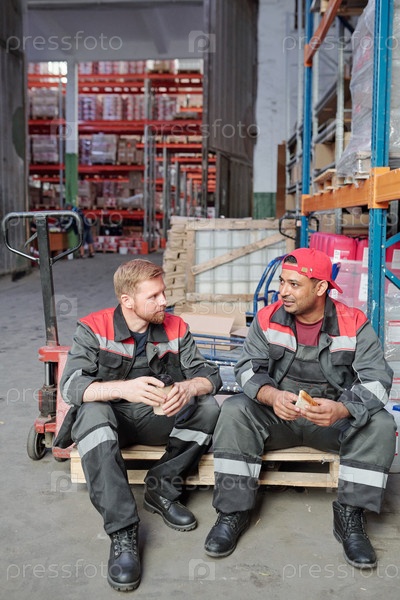 Два молодых голодных рабочего-мужчины обедают на промышленной тележке под стойкой в складе