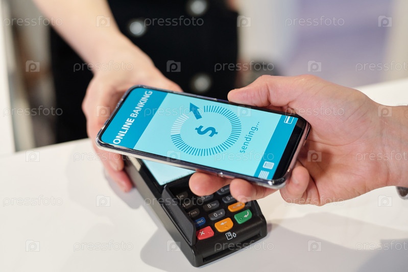 Рука молодого человека, держащего смартфон над терминалом во время бесконтактной оплаты