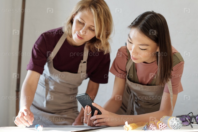 Молодая женщина наклоняется над столом и кладет стеклянные бусы, в то время как девушка фотографирует