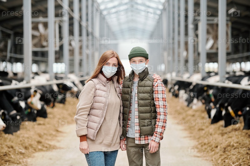 Мать и сын-подросток в масках на коровнике