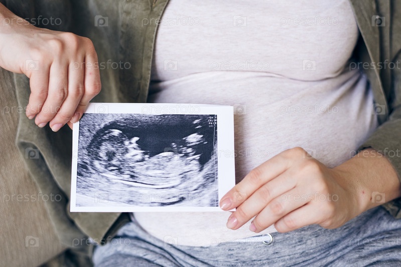 Руки беременной женщины в повседневной одежде, держащей фотографию своего будущего ребенка
