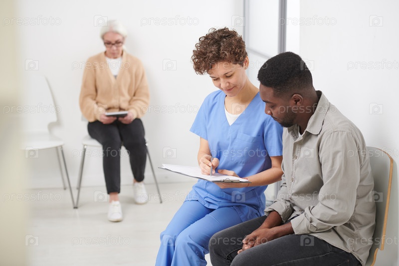 Женщина-врач сидит на стуле в коридоре больницы, показывая результаты анализов крови своему афроамериканскому пациенту