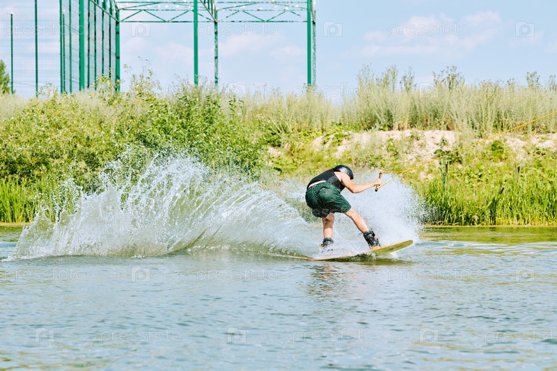 Задний вид молодого активного спортсмена, движущегося на доске для серфинга и брызг воды