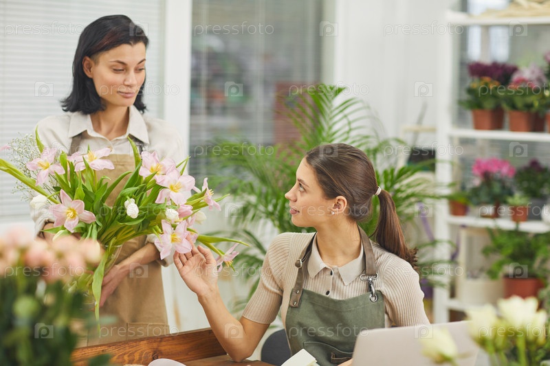 Две молодые женщины управляют цветочным магазином