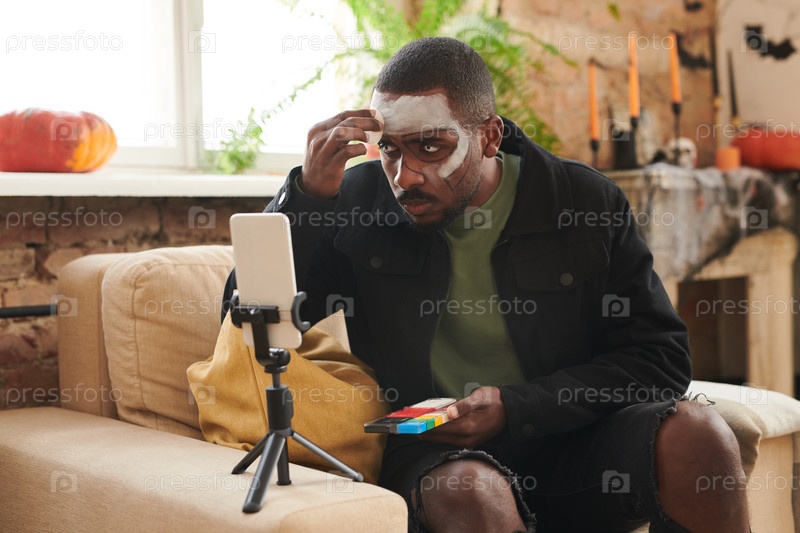 Серьезный молодой афроамериканец в черной куртке сидит в кресле и снимает видео на смартфоне, как покрасить лицо для вечеринки Хэллоуина