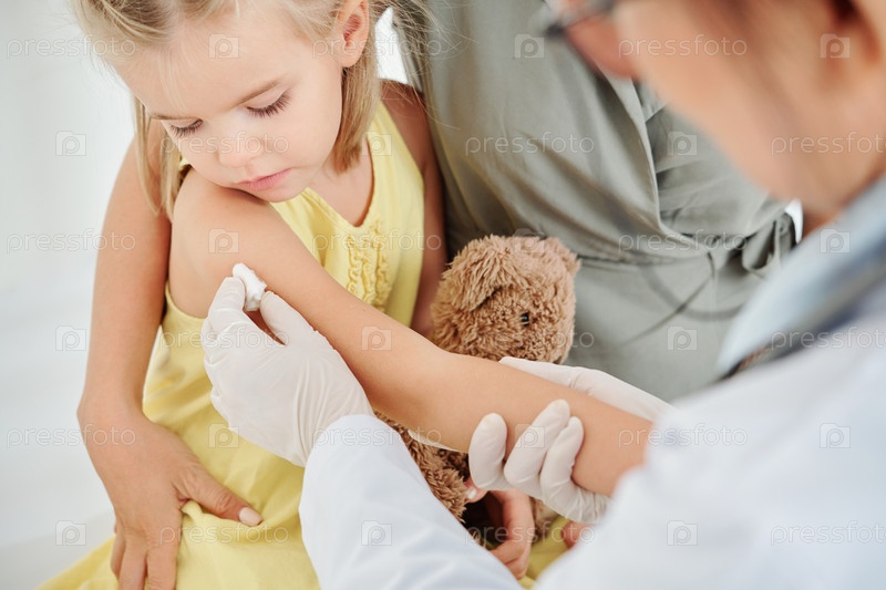 Педиатр занимается уборкой сайта с алкогольным тампоном