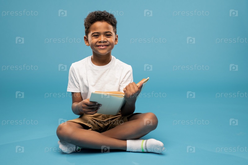 Милый маленький школьник африканской этнической принадлежности, держащий открытую книгу рядом с лицом