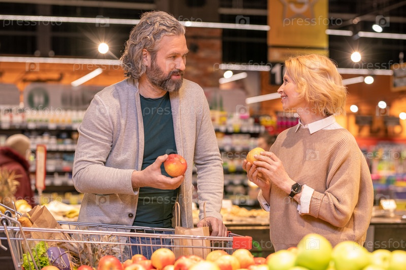 Зрелая пара с корзиной для покупок обсуждает различные виды яблок в супермаркете