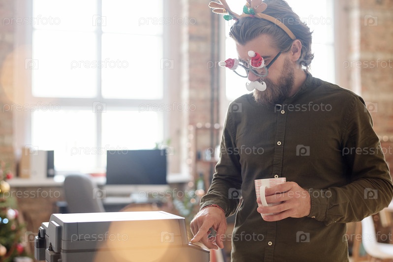 Молодой бизнесмен в рождественских очках с усами, согнувшийся над ксерокс-машиной