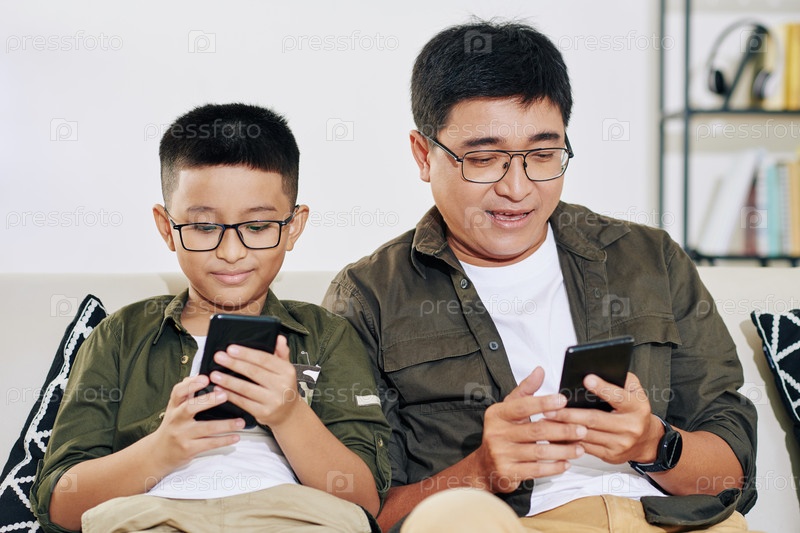 Отец и сын играют в игры на смартфонах