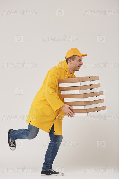 Парень-доставщик, бегущий на белой пицце