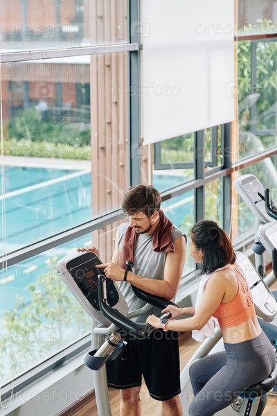 Фитнес-тренировщик помогает женщине установить программу