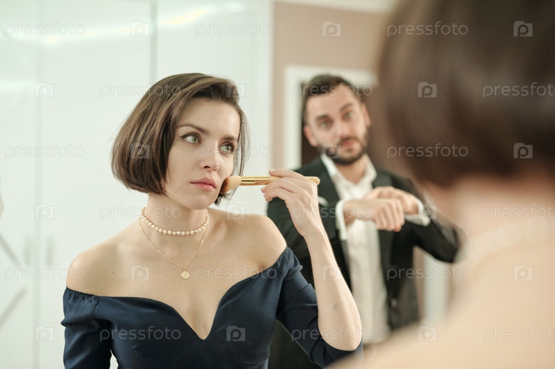 Молодая красивая женщина в черном вечернем платье наносит порошок на лицо