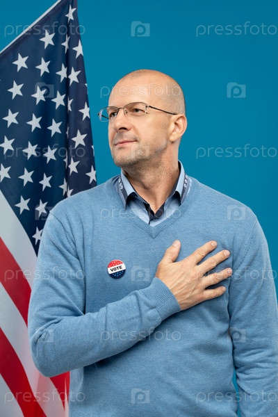 Успешный зрелый бизнесмен с рукой на груди стоит перед камерой