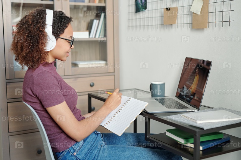 Молодая старательная студентка в повседневной одежде и наушниках делает заметки в копиях