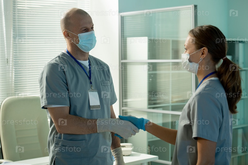 Успешный мужчина, работающий в научной лаборатории, обнимает руку своей помощницы