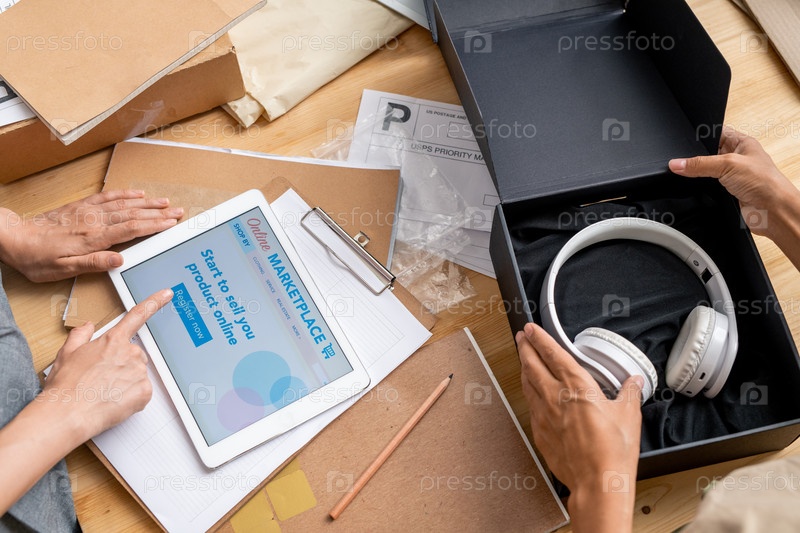Руки менеджера интернет-магазина с сенсорным экраном, указывающим на домашнюю страницу