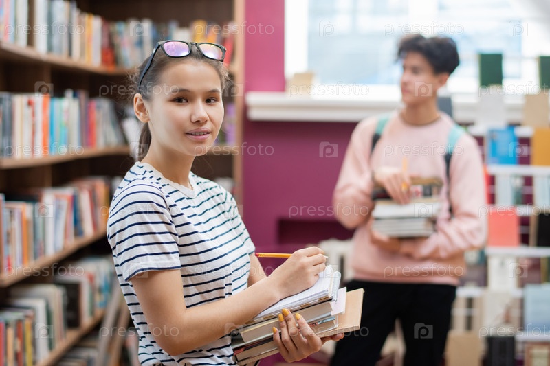 Красивая девочка-подросток с кучей книг и карандашом смотрит на тебя в библиотеке