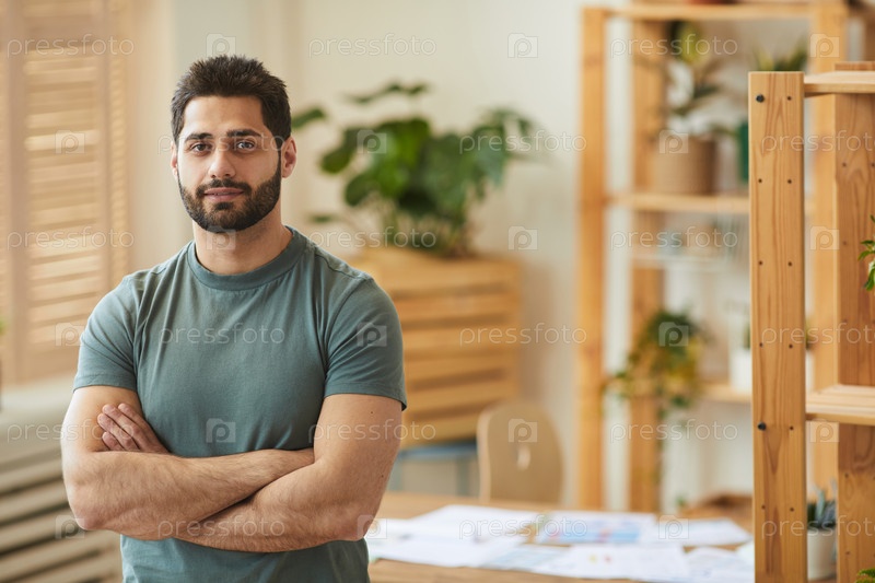 Бородатый мужчина позирует на зеленом офисном рабочем месте