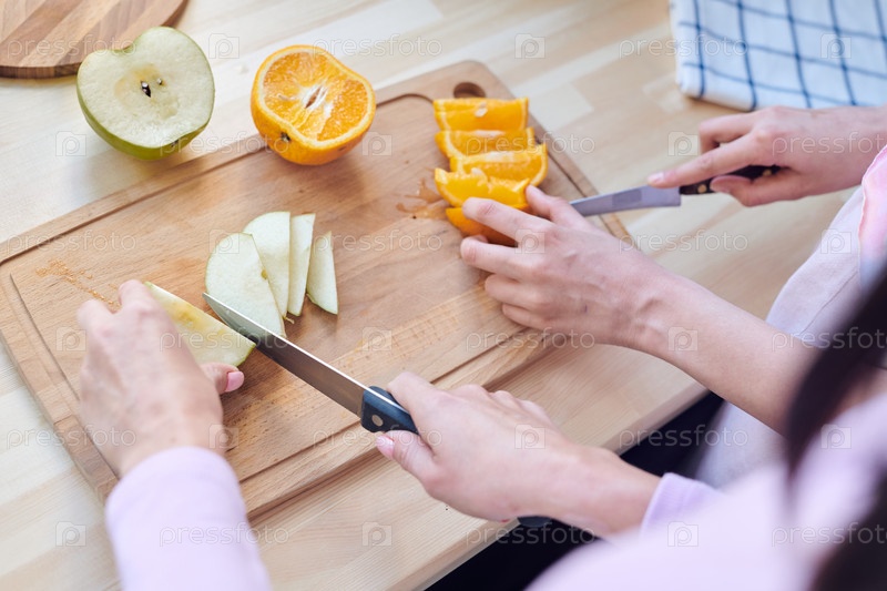 Руки двух молодых современных женщин с ножами, нарезающих свежие фрукты