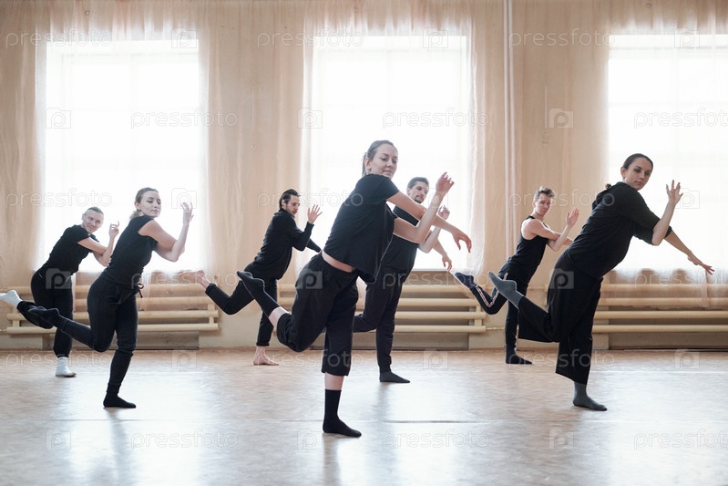 Семь активных молодых мужчин и женщин в черной спортивной одежде тренируются в студии