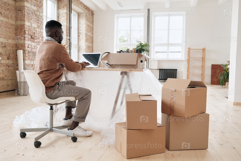 Задний вид бородатого чёрного менеджера в свитере, сидящего за столом под полиэтиленом и работающего с ноутбуком в пустом офисе со смещающимися коробками