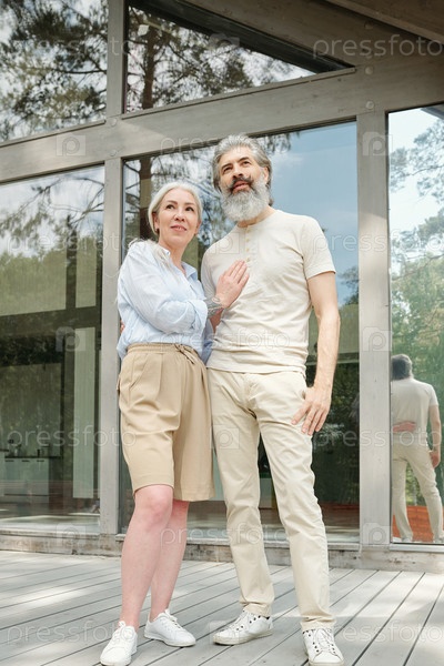 Старшая пара стоит напротив коттеджа
