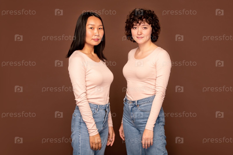Две молодые женщины в белых пуловерах и синих джинсах стоят рядом друг с другом