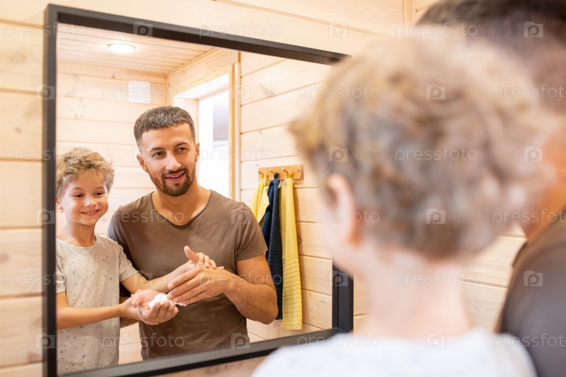 Милый мальчик с светлыми волосами смотрит на отца, который собирается использовать пену для лица