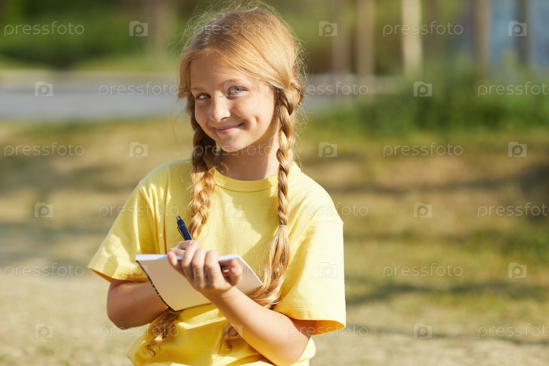 Улыбающаяся школьница держит блокнот на открытом воздухе