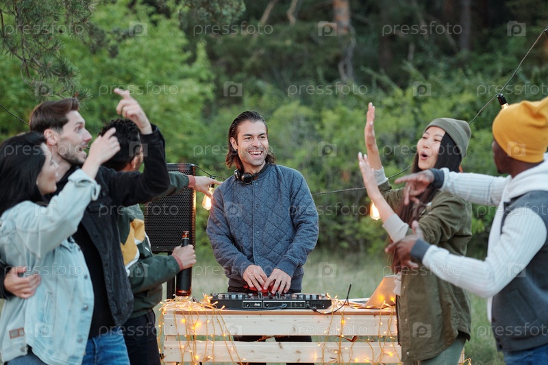 Веселый парень в куртке и наушниках, исполняющий музыку перед танцующей толпой