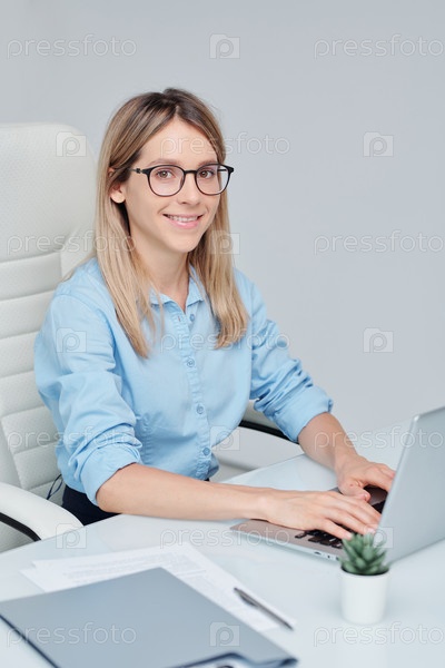 Молодая успешная бизнесвумен в очках смотрит на вас с зубчатой улыбкой