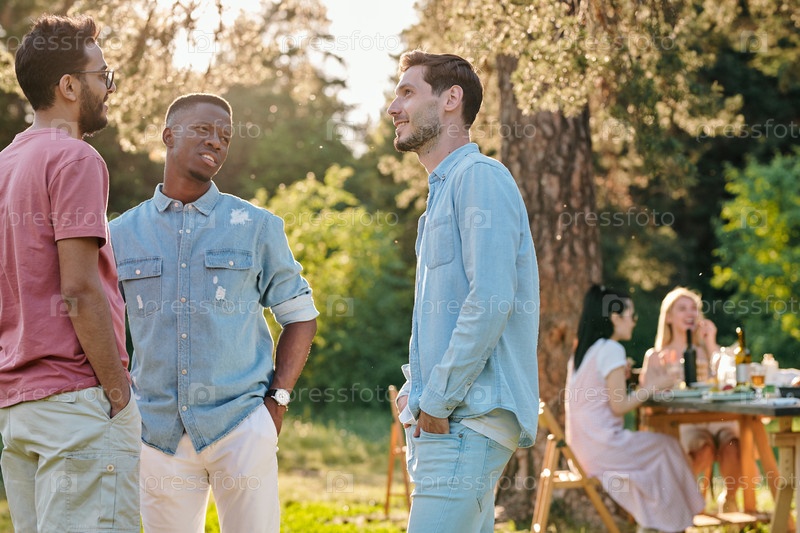 Трое молодых межкультурных мужчин в повседневной одежде стоят на зеленом газоне в летний день