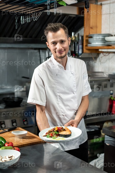 Счастливый молодой профессиональный шеф-повар в белой форме, держащий тарелку с приготовленной едой