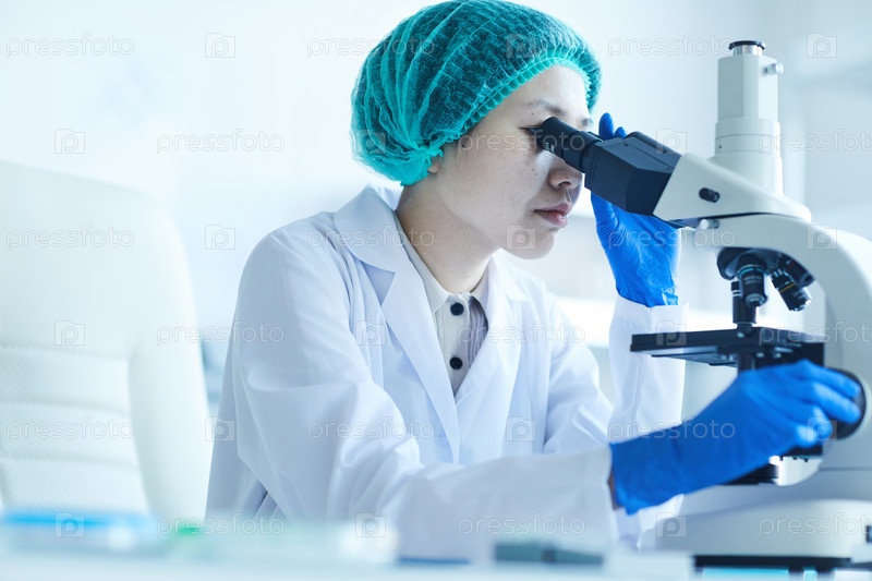 Женщина изучает образцы с помощью микроскопа
