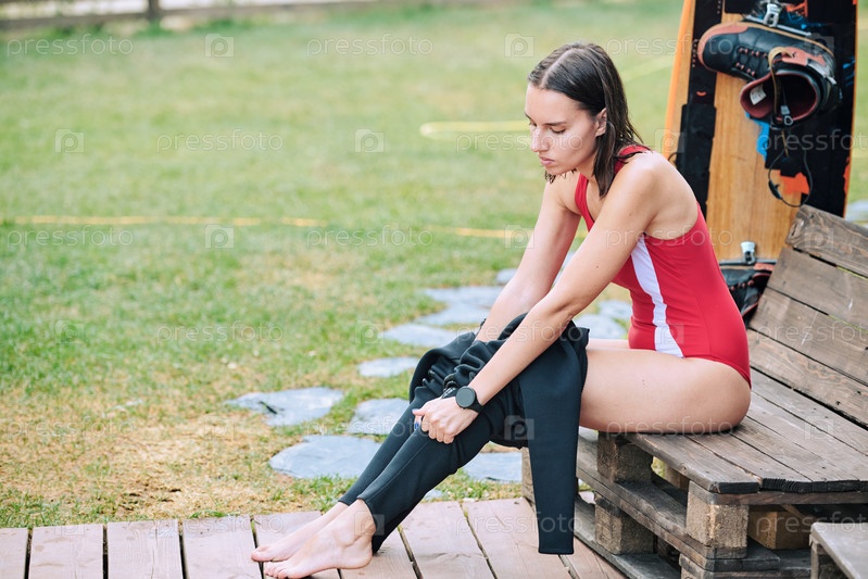 Красивая брюнетка-спортсменка с темными мокрыми волосами, надевающая черные носки