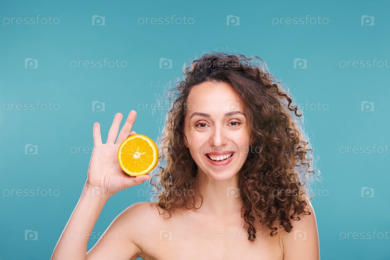 Счастливая молодая женщина с длинными темными кудрявыми волосами, держащая в руках половину свежего сочного апельсина