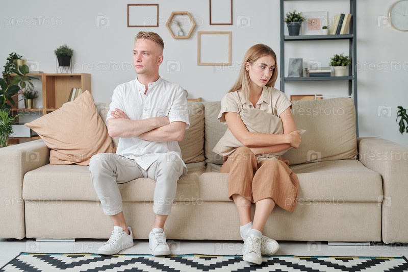 Молодой мужчина и молодая женщина с перекрещенными руками у груди, выражающие печаль и обиду