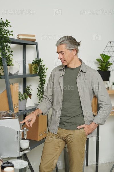 Серьезный зрелый офисник с конским хвостом, использующий автоматическую кофемашину во время выхода на кофе
