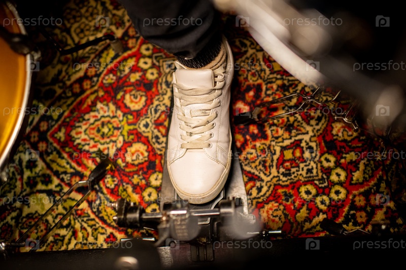 Нога молодого музыканта в крестовых ботинках, толкающего педаль электрического барабана