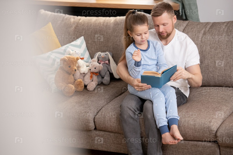 Красивая девушка в пижаме сидит на коленях у своего отца, читая сказки