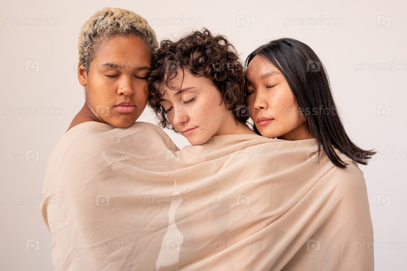 Группа молодых межкультурных женщин с закрытыми глазами, завернутых в белое льняное полотно