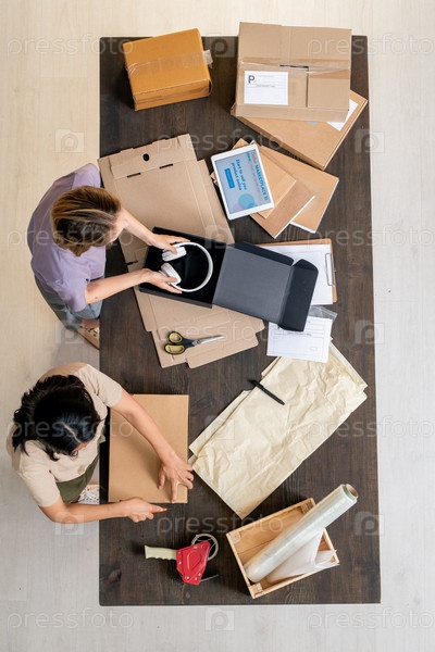 Вид сверху двух молодых женщин-менеджеров интернет-магазина, упаковывающих заказы клиентов